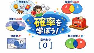 くじやさいころを例に、確率の基本用語を中学生向けにやさしく解説します。試行、全事象、事象、根源事象、和集合・積集合、余事象、排反事象まで基礎から学べます。