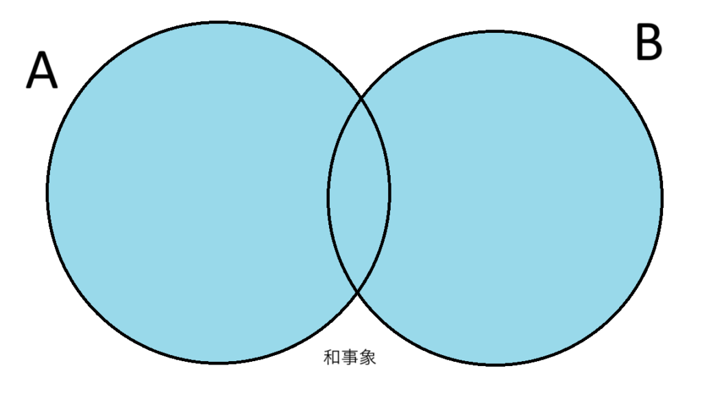 事象A,Bがあるとき、A\(\cup\)Bのことを和事象といい、AかBのどちらかに含まれる根源事象の全体になります。AまたはBが起こる結果の集合です。